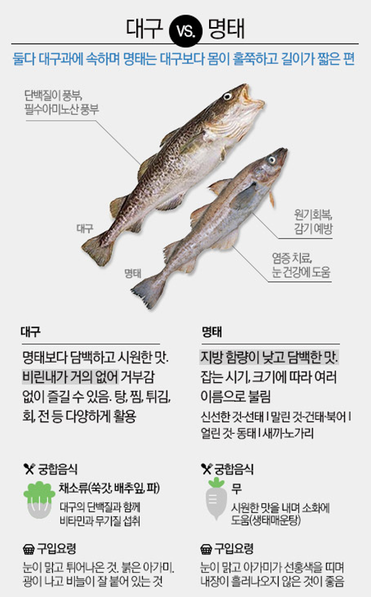 대구는 어린이의 성장과 어르신들의 기력회복에 도움이 되는 류신, 라이신 등 필수 아미노산이 풍부하며, 겨울철 추운날씨로 떨어지기 쉬운 면역력과 피로감 회복에 도움이 되고, 간 기능을 개선 해주는 함황 아미노산이 다량 함유돼 있다. 또 대구는 고단백, 저지방 식품으로 맛이 담백해 무, 대파 등을 넣고 끓인 시원한 탕이나 찜으로 주로 먹지만 대구살을 살짝 구워 브로콜리, 양파 등 각종 야채를 곁들여 스테이크로 먹어도 그 맛이 별미다.