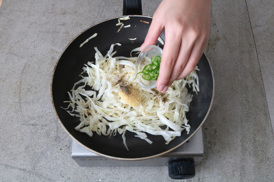 그 위에 이제 볶아 놓은 양배추를 올려주면
