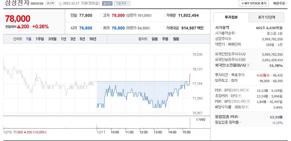 17일 국내 증시에서 삼성전자는 전날보다 0.26% 오른 7만8000원에 거래를 마쳤다.